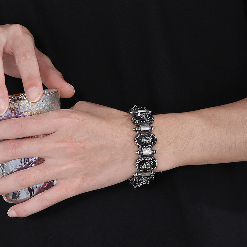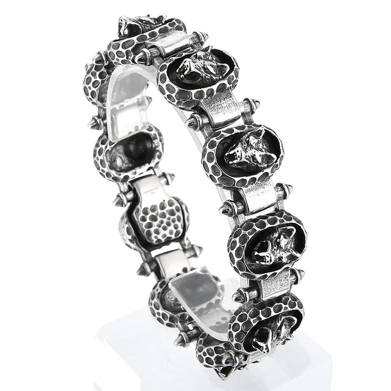 复古做旧捶打纹圆牌机车手环 朋克风霸气钛钢钉子狼头男士手链