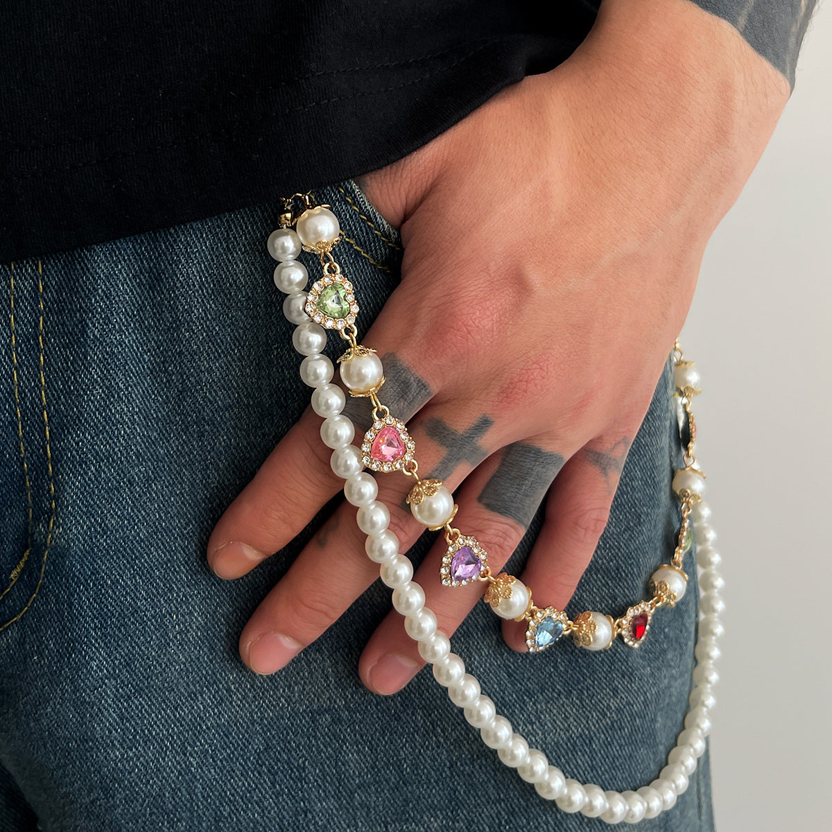 欧美跨境设计感仿珍珠小花链条裤链 嘻哈彩色镶钻十字架腰链挂饰