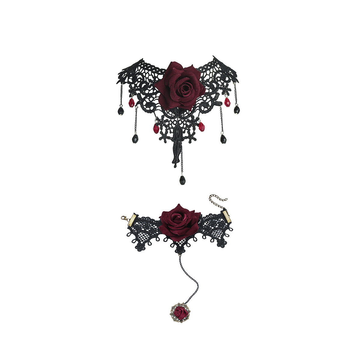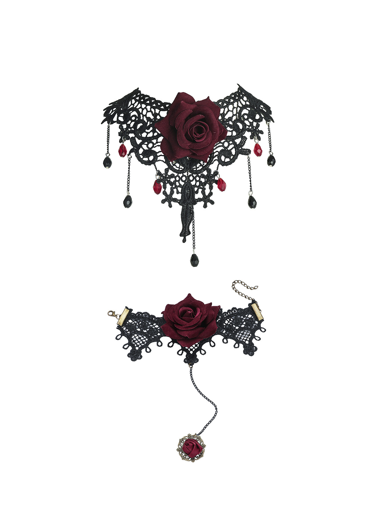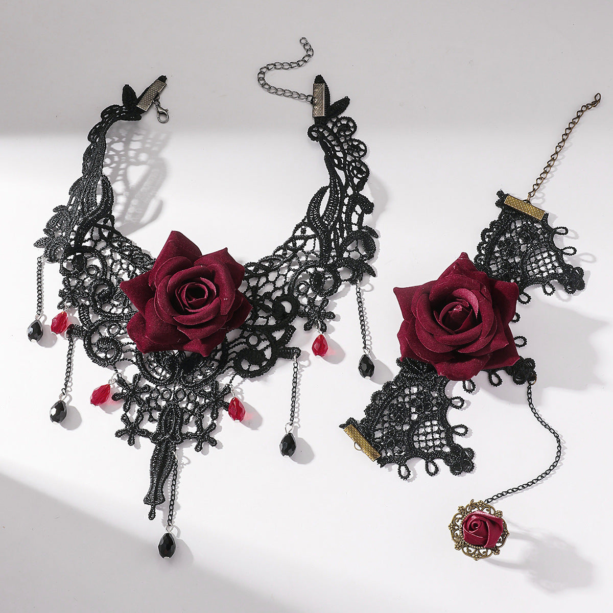 欧美跨境 复古黑色蕾丝玫瑰花项链手链戒指套装女 暗黑风颈链手饰