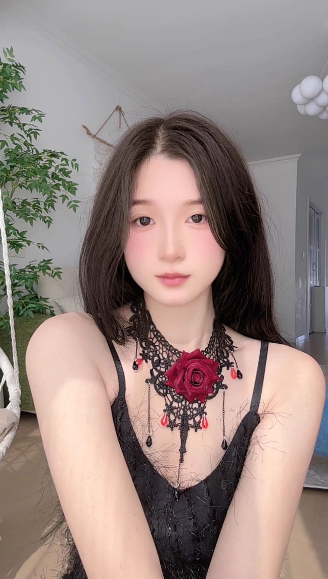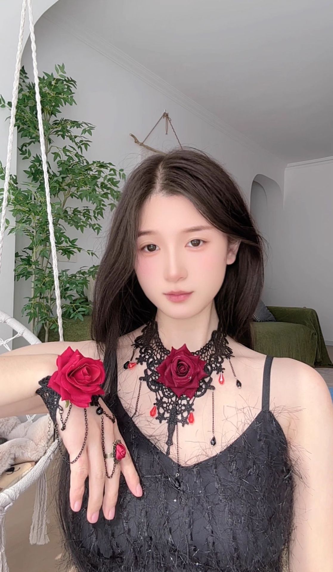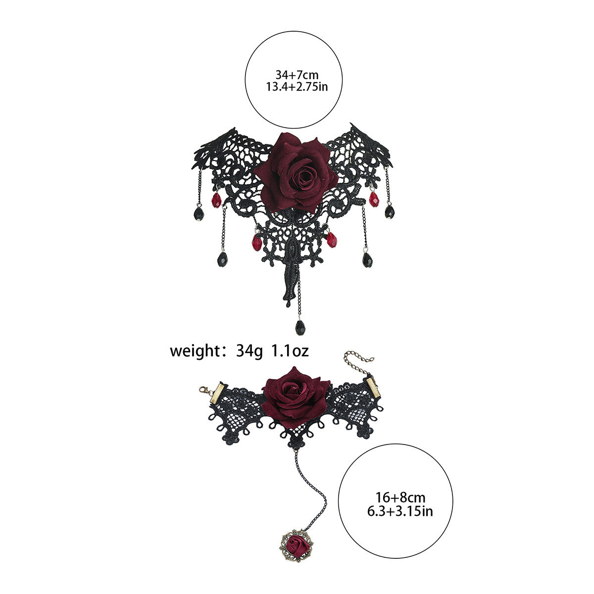 欧美跨境 复古黑色蕾丝玫瑰花项链手链戒指套装女 暗黑风颈链手饰