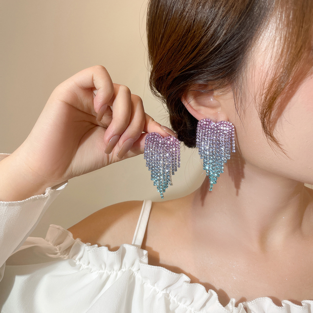 跨境 情人节大爆款 渐变色爱心水钻流苏耳环女高级感水钻耳钉耳饰