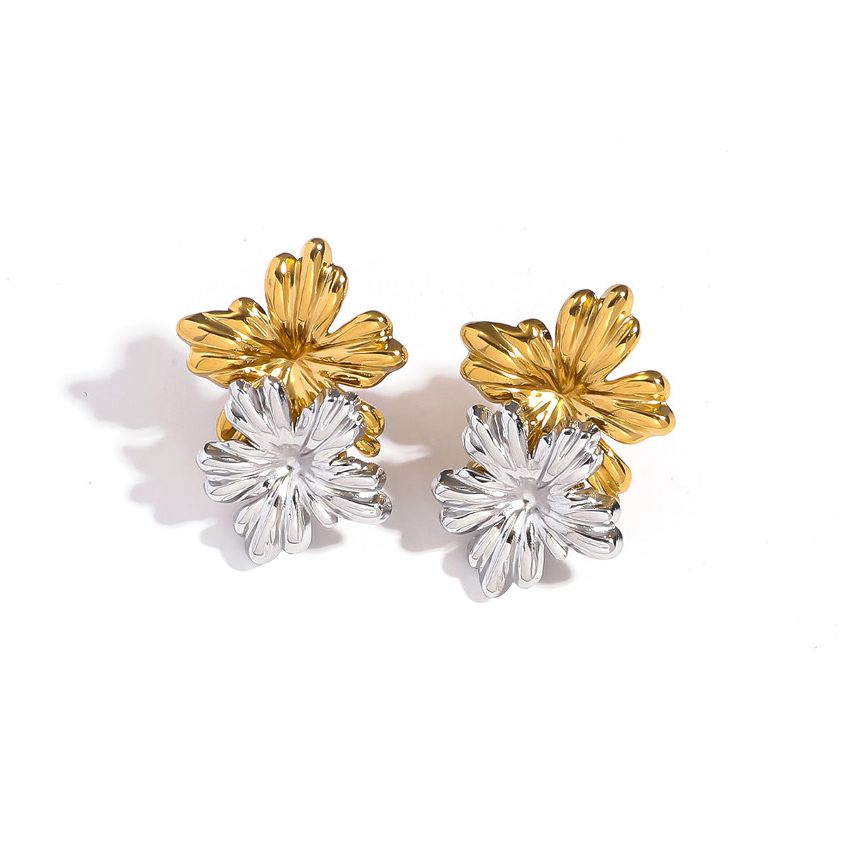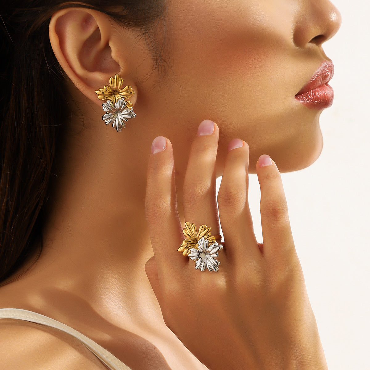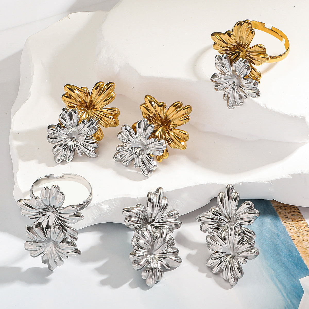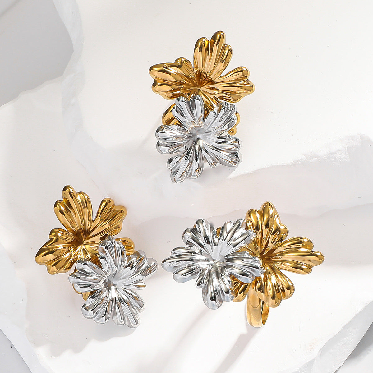 麦芽不锈钢花朵小雏菊金银拼色耳钉耳环开口戒指指环小众设计耳饰