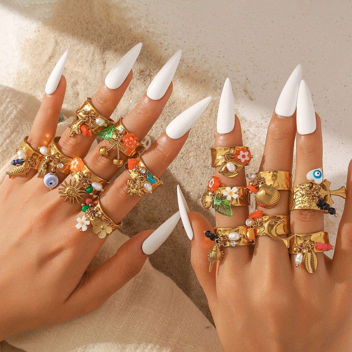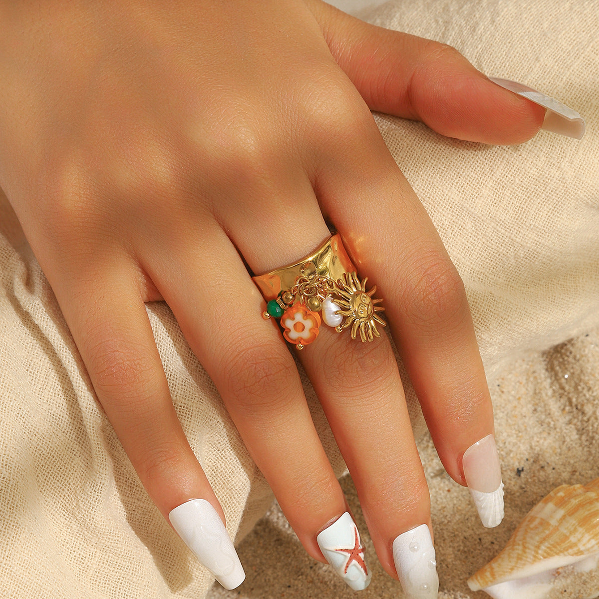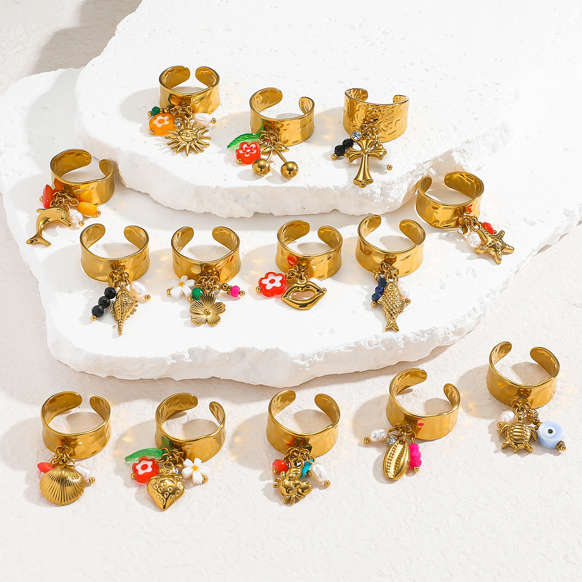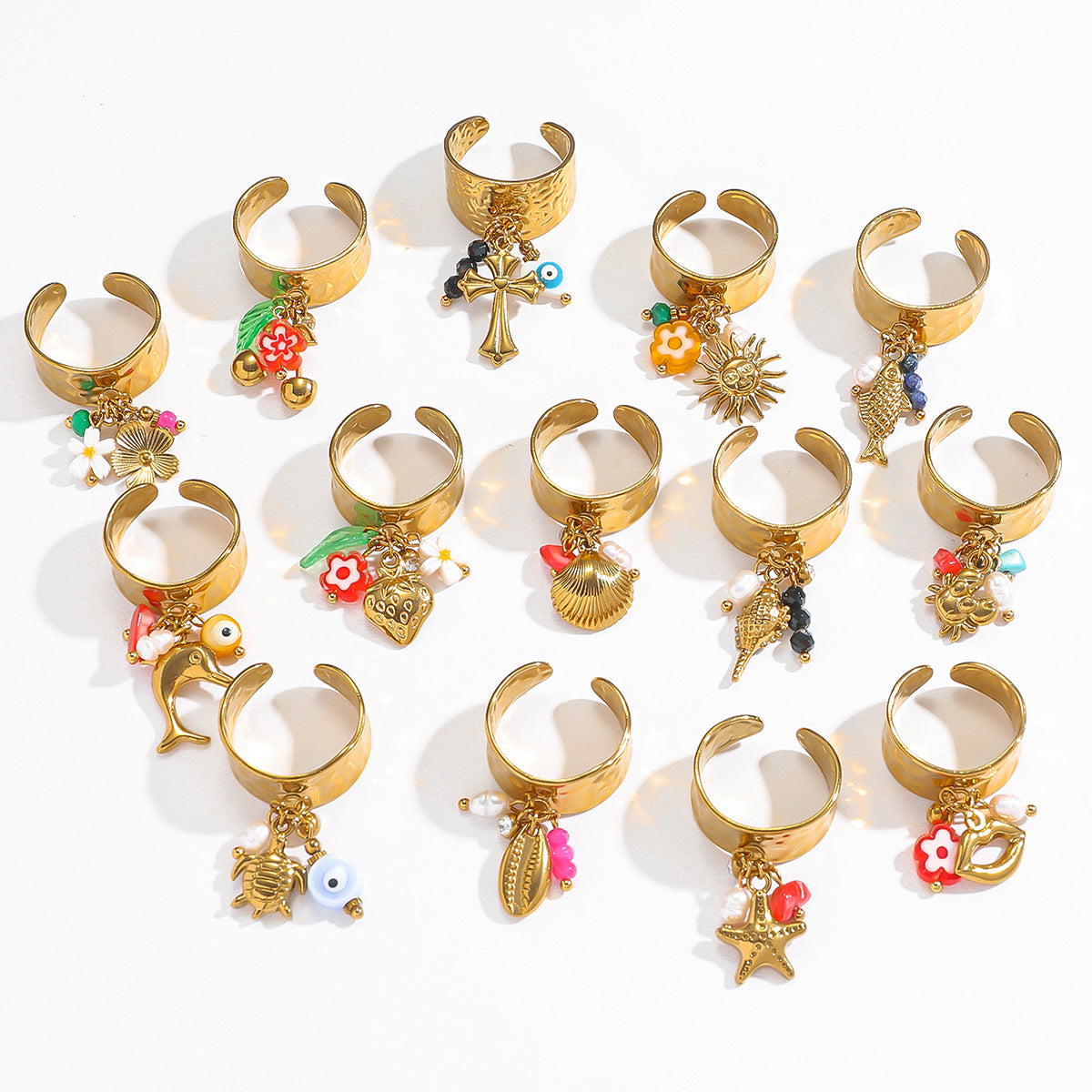麦芽欧美不锈钢度假风开口戒指海螺海星贝壳珍珠花樱桃指环手饰品