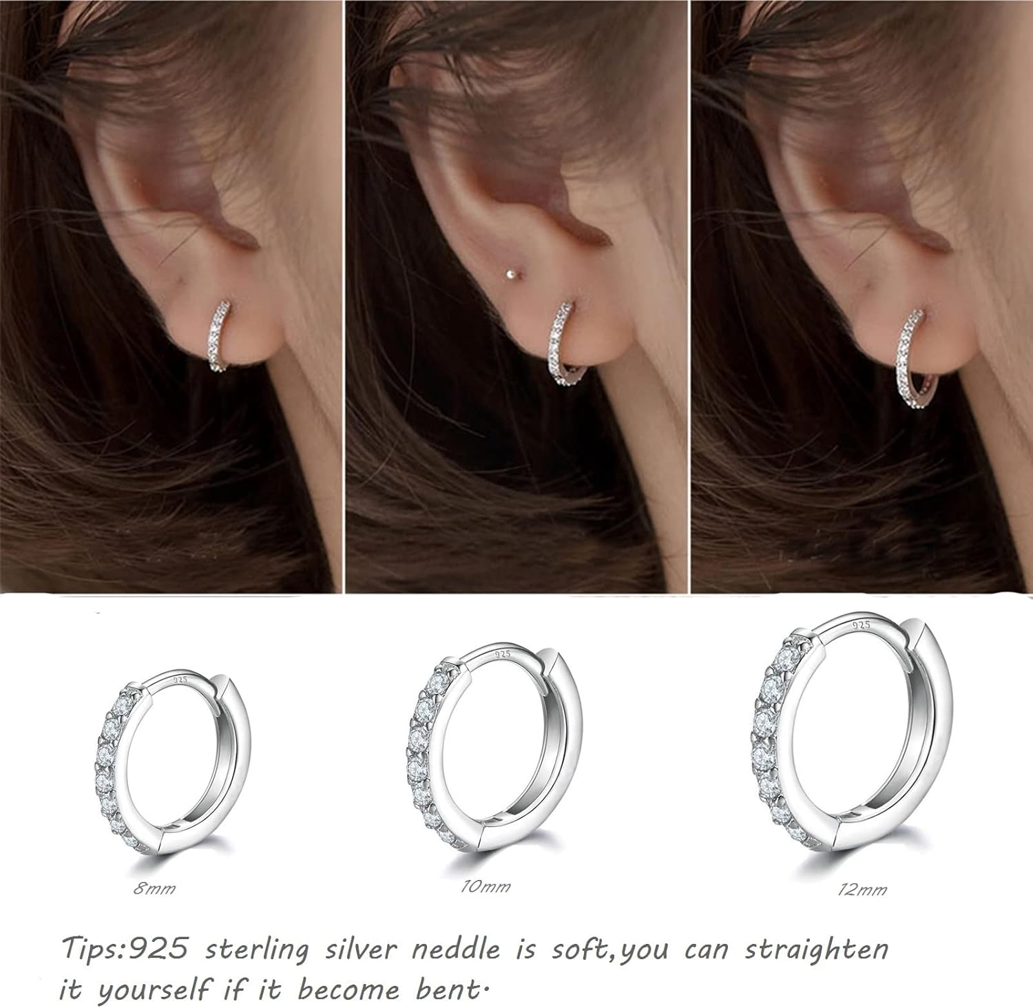 925 Sterling Silver Small Hoop Earrings Cubic Zirconia Huggie Hoop Earrings, 3 Pairs 14K White Gold Plated Cartilage Piercing Earrings Ear Cuff Tiny Hoop Earrings for Women Men