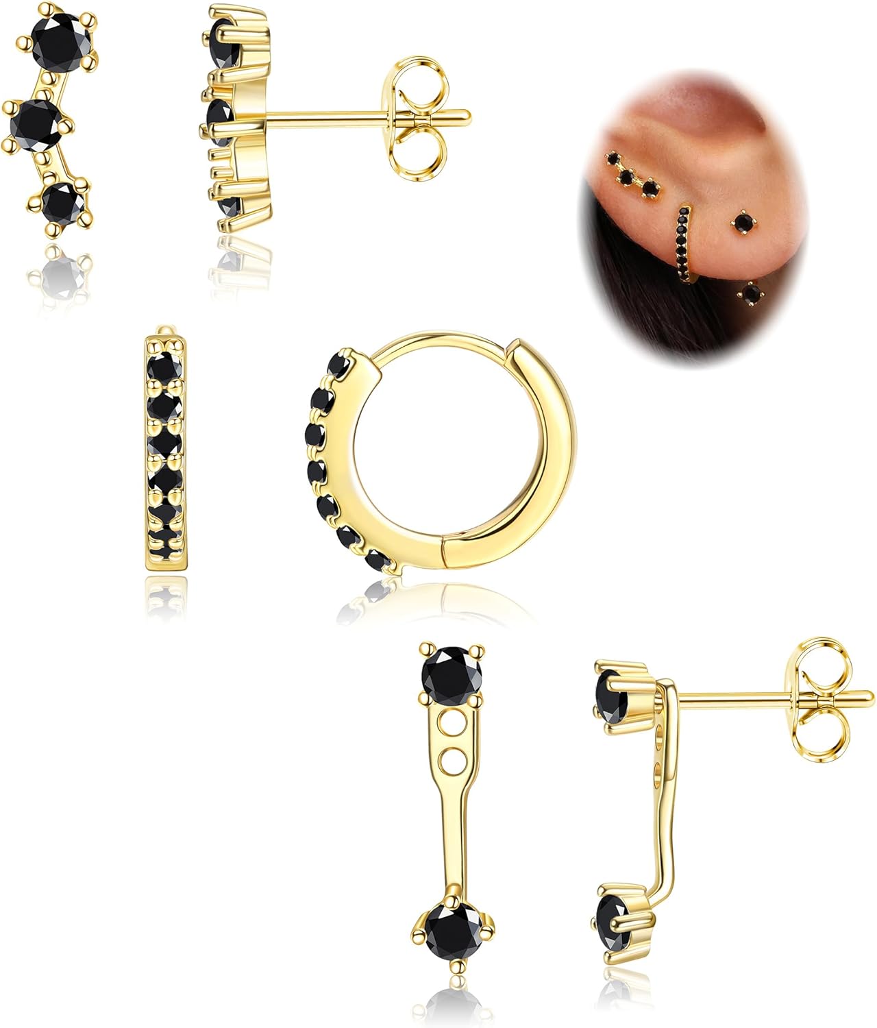 FIASASO 3 Pairs 925 Sterling Silver Hypoallergenic Earrings Set for Multiple Piercing Dainty 14K Gold Plated Stud Huggie Small Hoop Earrings for Women Trendy Cute Earring Stacks for Sensitive Ears