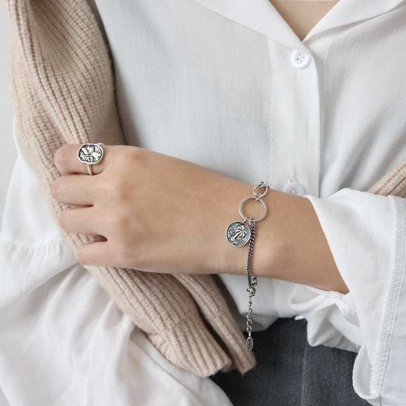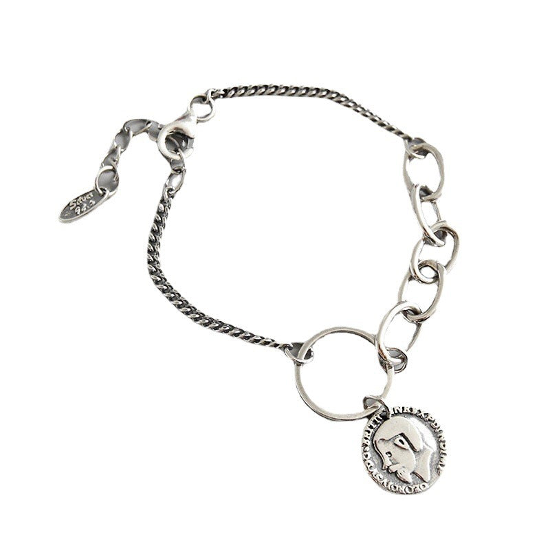 YHT002韩版个性学生银饰复古做旧设计人像硬币吊坠S925纯银手链女